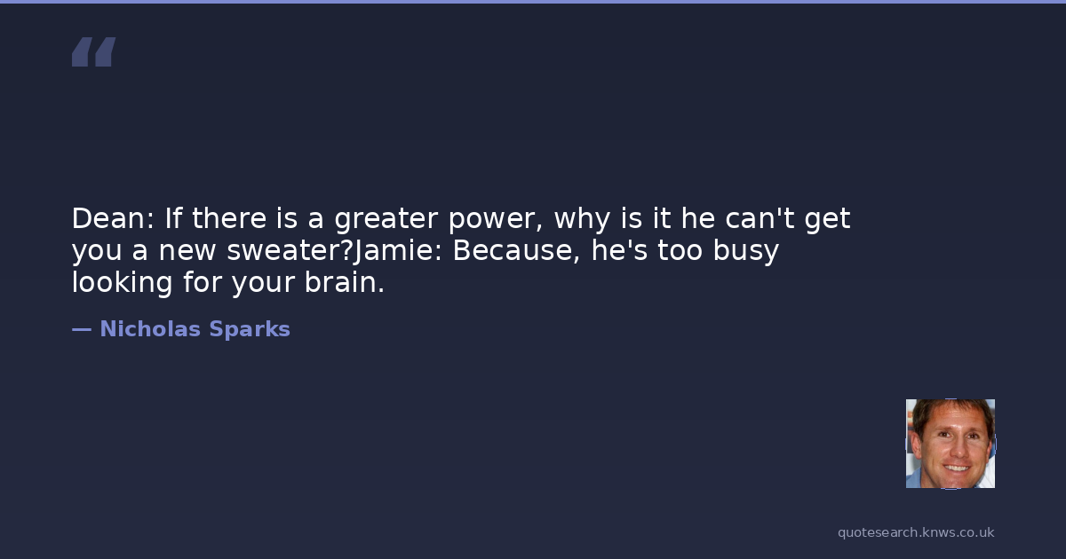 Dean: If there is a greater power, why is it he can't get you a new sweater?Jamie: Because, he's too busy looking for your brain.