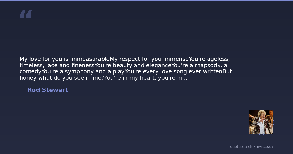 My love for you is immeasurableMy respect for you immenseYou're ageless, timeless, lace and finenessYou're beauty and eleganceYou're a rhapsody, a comedyYou're a symphony and a playYou're every love song ever writtenBut honey what do you see in me?You're in my heart, you're in my soulYou'll be my breath should I grow oldYou are my lover, you're my best friendYou're in my soul