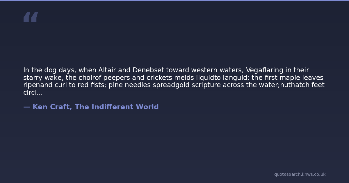 In the dog days, when Altair and Denebset toward western waters, Vegaflaring in their starry wake, the choirof peepers and crickets melds liquidto languid; the first maple leaves ripenand curl to red fists; pine needles spreadgold scripture across the water;nuthatch feet circle tree trunks--gentle scrivenersscribing the dawn of dying days.
