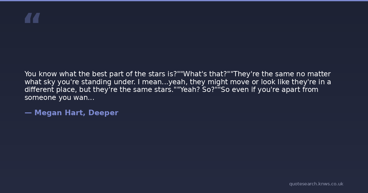 You know what the best part of the stars is?""What's that?""They're the same no matter what sky you're standing under. I mean...yeah, they might move or look like they're in a different place, but they're the same stars.""Yeah? So?""So even if you're apart from someone you want to be with, you can look up at the stars and know they're looking at the same ones.