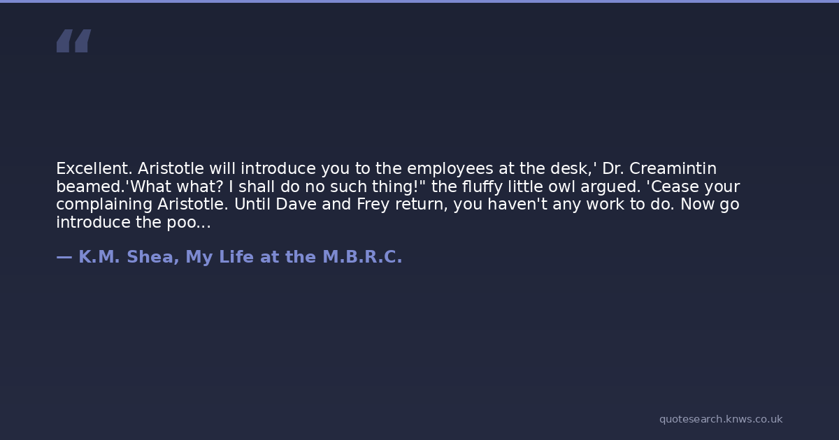 Excellent. Aristotle will introduce you to the employees at the desk,' Dr. Creamintin beamed.'What what? I shall do no such thing!" the fluffy little owl argued. 'Cease your complaining Aristotle. Until Dave and Frey return, you haven't any work to do. Now go introduce the poor girl,' Dr. Creamintin ordered. 'Nevah, I say, nevah!' the owl decided, shaking his little butt. 'Too bad, I say, too bad,' Dr. Creamintin mocked before snatching the little bird off his stand on Felisha's desk and throwing him out of the office.
