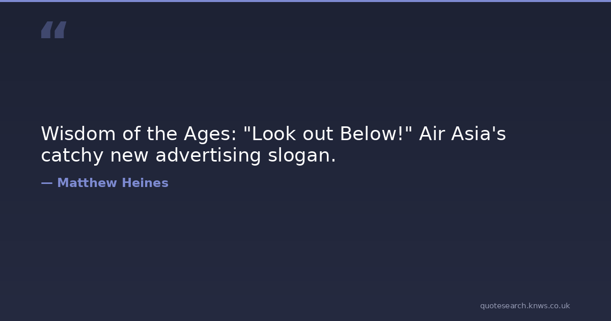 Wisdom of the Ages: "Look out Below!" Air Asia's catchy new advertising slogan. funny-but-sad funny-quotes humor-quotes humorist humorous humorous-quotes Download Image Share on X Share on Facebook Copy Link