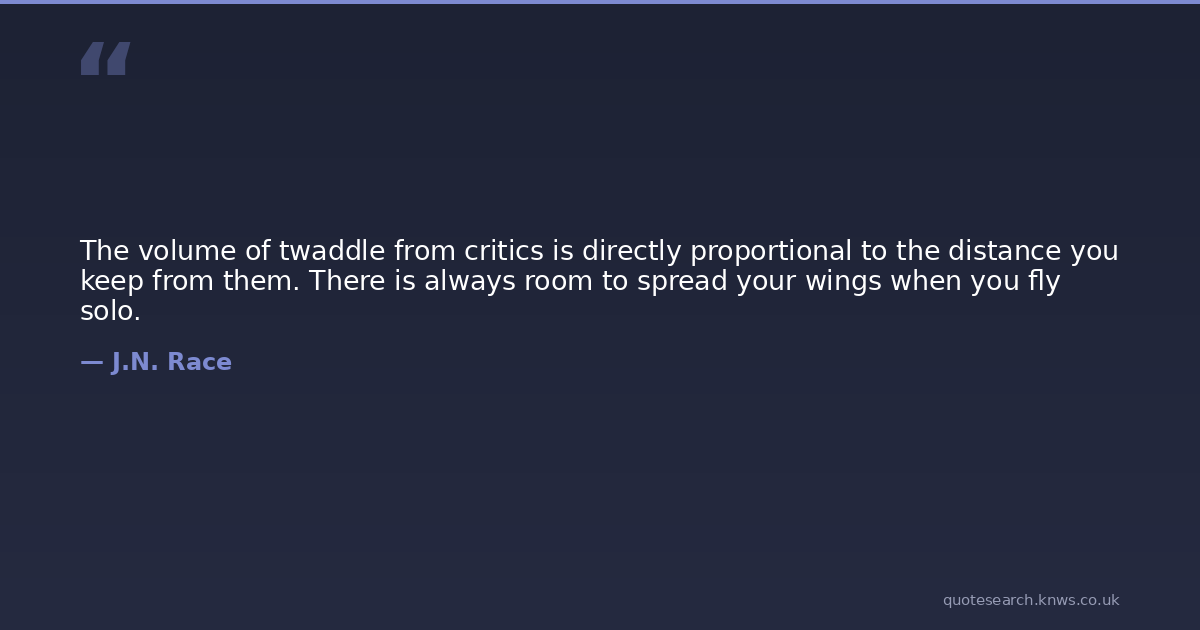 The volume of twaddle from critics is directly proportional to the distance you keep from them. There is always room to spread your wings when you fly solo.