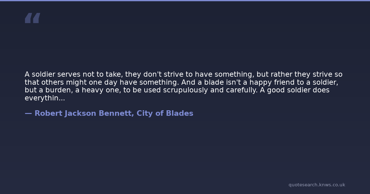 A soldier serves not to take, they don't strive to have something, but rather they strive so that others might one day have something. And a blade isn't a happy friend to a soldier, but a burden, a heavy one, to be used scrupulously and carefully. A good soldier does everything they can so they do not have to kill. That's what training is for. But if we have to, we will. And when we do that we give up some part of ourselves, as we're asked to do.