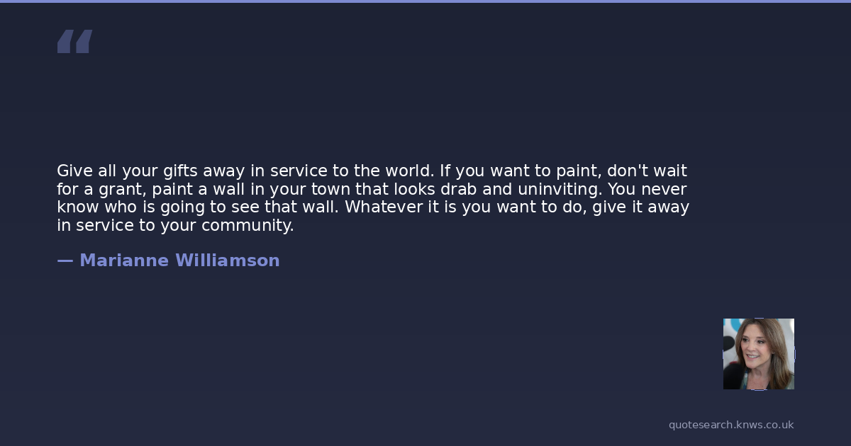 Give all your gifts away in service to the world. If you want to paint, don't wait for a grant, paint a wall in your town that looks drab and uninviting. You never know who is going to see that wall. Whatever it is you want to do, give it away in service to your community.