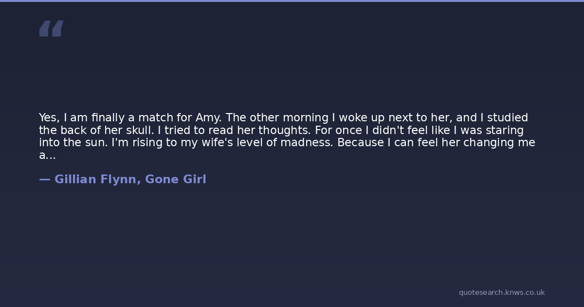 Yes, I am finally a match for Amy. The other morning I woke up next to her, and I studied the back of her skull. I tried to read her thoughts. For once I didn't feel like I was staring into the sun. I'm rising to my wife's level of madness. Because I can feel her changing me again: I was a callow boy, and then a man, good and bad. Now at last I'm the hero. I am the one to root for in the never-ending war story of our marriage. It's a story I can live with. Hell, at this point, I can't imagine my story without Amy. She is my forever antagonist.We are one long frightening climax.