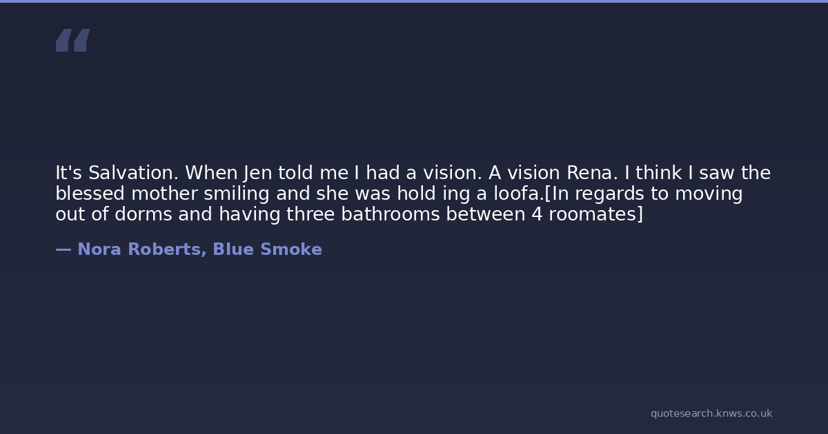 It's Salvation. When Jen told me I had a vision. A vision Rena. I think I saw the blessed mother smiling and she was hold ing a loofa.[In regards to moving out of dorms and having three bathrooms between 4 roomates]