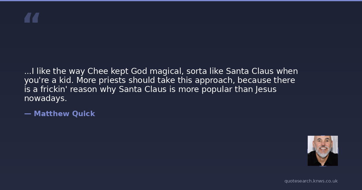 ...I like the way Chee kept God magical, sorta like Santa Claus when you're a kid. More priests should take this approach, because there is a frickin' reason why Santa Claus is more popular than Jesus nowadays.