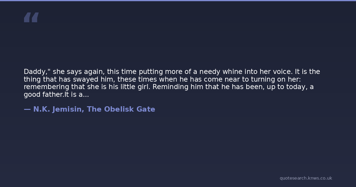 Daddy," she says again, this time putting more of a needy whine into her voice. It is the thing that has swayed him, these times when he has come near to turning on her: remembering that she is his little girl. Reminding him that he has been, up to today, a good father.It is a manipulation. Something of her is warped out of true by this moment, and from now on all her acts of affection toward her father will be calculated, performative. Her childhood dies, for all intents and purposes. But that is better than all of her dying, she knows.