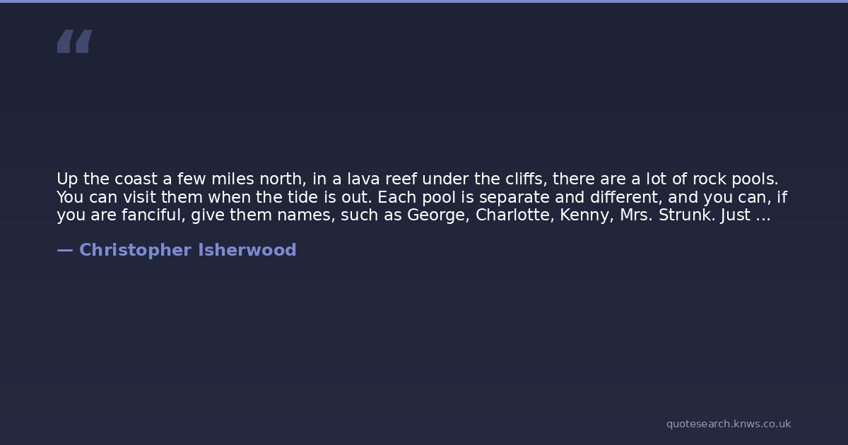 Up the coast a few miles north, in a lava reef under the cliffs, there are a lot of rock pools. You can visit them when the tide is out. Each pool is separate and different, and you can, if you are fanciful, give them names, such as George, Charlotte, Kenny, Mrs. Strunk. Just as George and the others are thought of, for convenience, as individual entities, so you may think of a rock pool as an entity; though, of course, it is not. The waters of its consciousness - so to speak - are swarming with hunted anxieties, grim-jawed greeds, dartingly vivid intuitions, old crusty-shelled rock-gripping obstinacies, deep-down sparkling undiscovered secrets, ominous protean organisms motioning mysteriously, perhaps warningly, toward the surface light. How can such a variety of creatures co-exist at all? Because they have to. The rocks of the pool hold their world together. And, throughout the day of the ebb tide, they know no other.