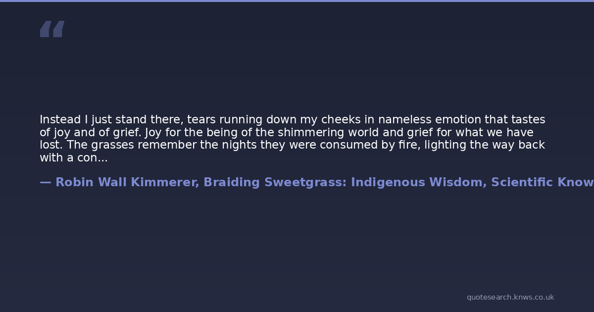 Instead I just stand there, tears running down my cheeks in nameless emotion that tastes of joy and of grief. Joy for the being of the shimmering world and grief for what we have lost. The grasses remember the nights they were consumed by fire, lighting the way back with a conflagration of love between species. Who today even knows what that means? I drop to my knees in the grass and I can hear the sadness, as if the land itself was crying for its people: Come home. Come home.There are often other walkers here. I suppose thats what it means when they put down the camera and stand on the headland, straining to hear above the wind with that wistful look, the gaze out to sea. They look like theyre trying to remember what it would be like to love the world.