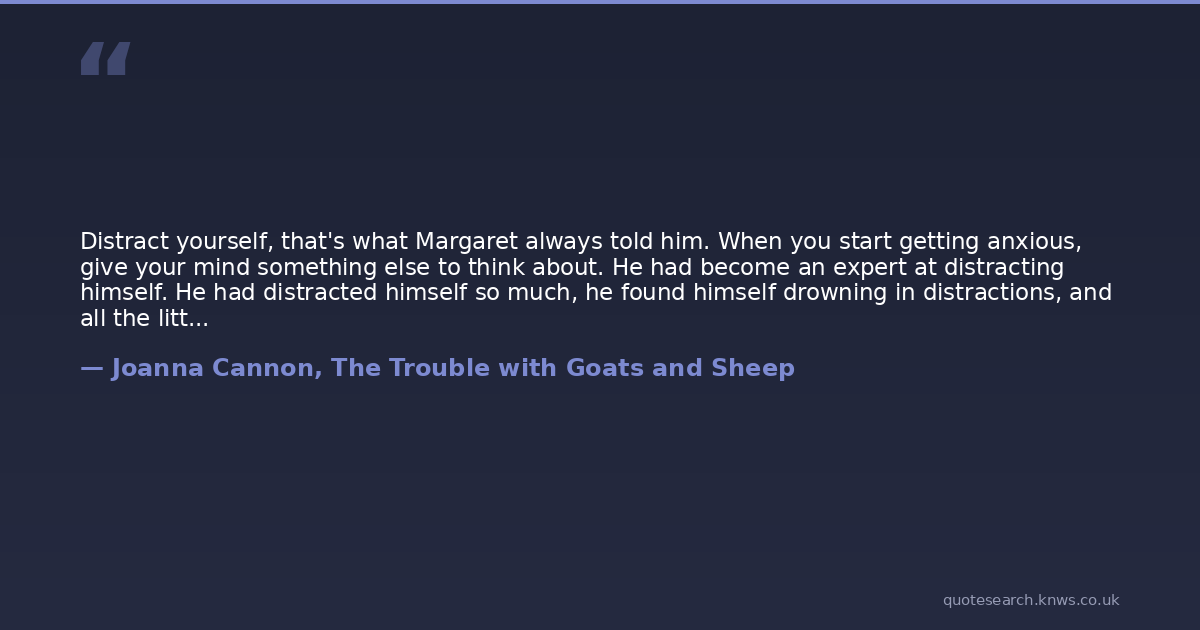 Distract yourself, that's what Margaret always told him. When you start getting anxious, give your mind something else to think about. He had become an expert at distracting himself. He had distracted himself so much, he found himself drowning in distractions, and all the little details in the world seemed to join up together in his head and make a whole new problem to worry about.