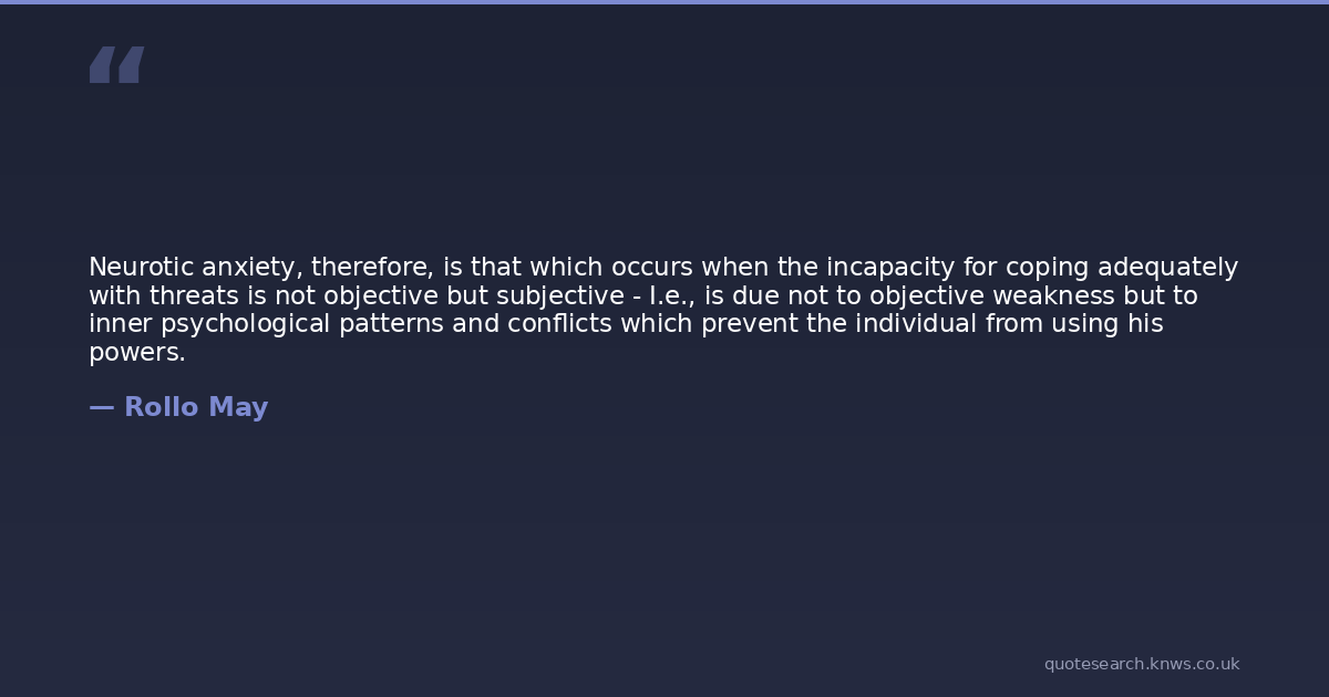 Neurotic anxiety, therefore, is that which occurs when the incapacity for coping adequately with threats is not objective but subjective - I.e., is due not to objective weakness but to inner psychological patterns and conflicts which prevent the individual from using his powers.