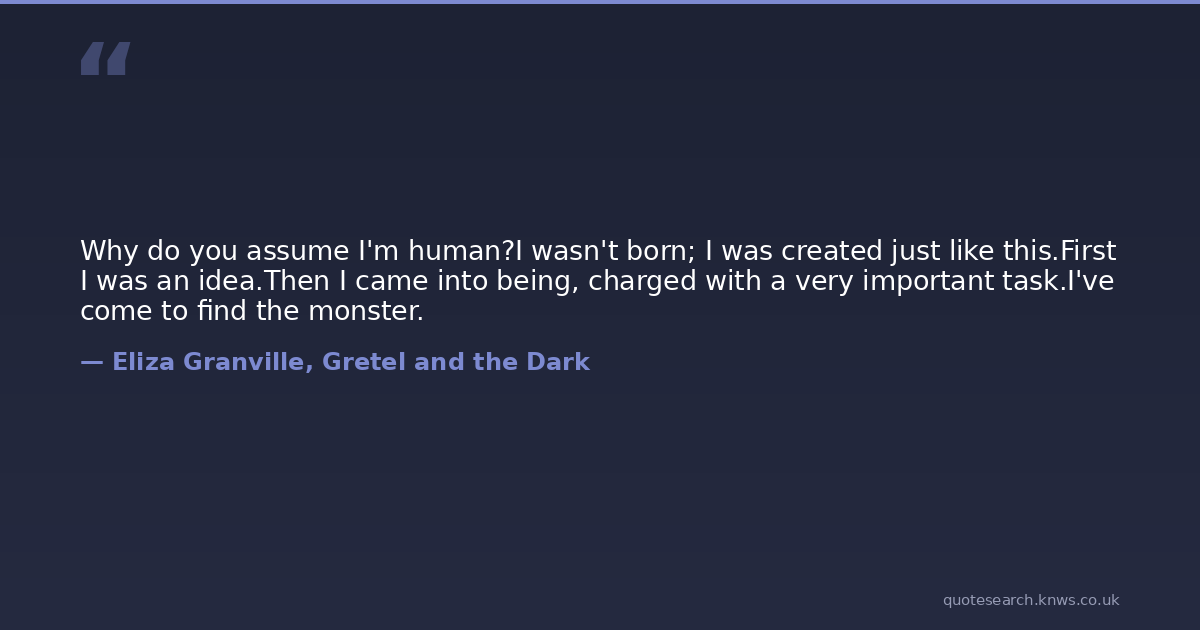 Why do you assume I'm human?I wasn't born; I was created just like this.First I was an idea.Then I came into being, charged with a very important task.I've come to find the monster.