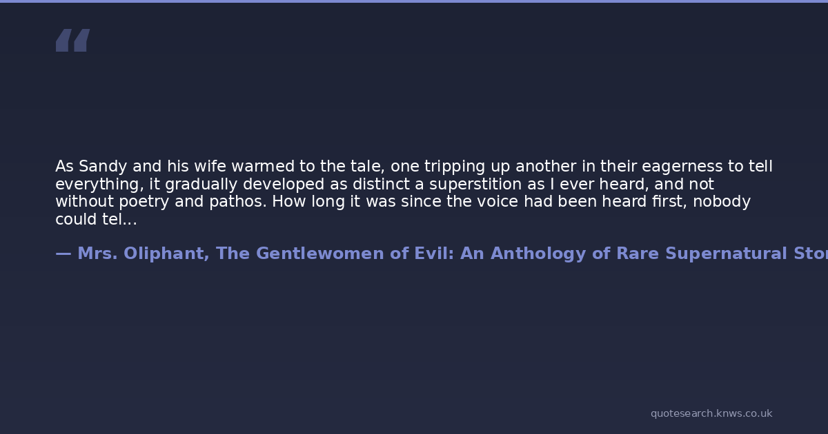 As Sandy and his wife warmed to the tale, one tripping up another in their eagerness to tell everything, it gradually developed as distinct a superstition as I ever heard, and not without poetry and pathos. How long it was since the voice had been heard first, nobody could tell with certainty. Jarvis's opinion was that his father, who had been coachman at Brentwood before him, had never heard anything about it, and that the whole thing had arisen within the last ten years, since the complete dismantling of the old house: which was a wonderfully modern date for a tale so well authenticated. According to these witnesses, and to several whom I questioned afterwards, and who were all in perfect agreement, it was only in the months of November and December that "the visitation" occurred. During these months, the darkest of the year, scarcely a night passed without the recurrence of these inexplicable cries. Nothing, it was said, had ever been seen - at least nothing that could be identified. Some people, bolder or more imaginative than the others, had seen the darkness moving, Mrs Jarvis said with unconscious poetry. ("The Open Door")
