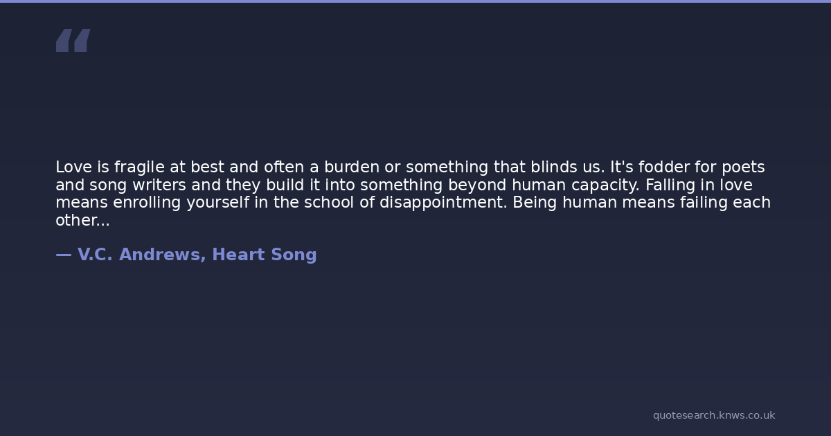 Love is fragile at best and often a burden or something that blinds us. It's fodder for poets and song writers and they build it into something beyond human capacity. Falling in love means enrolling yourself in the school of disappointment. Being human means failing each other often, and no two people fail each other more than two people who pledge to do things for each other that they'll never do because they are just incapable of it...That's why art is enduring. The look of love or hope, or the look of compassion, bravery, whatever, is captured forever. We spend our lives trying to get someone to be as enduring as a painting or a sculpture and we can't because feelings crumble as quickly as the flesh.