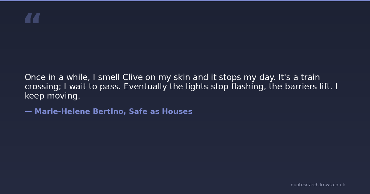 Once in a while, I smell Clive on my skin and it stops my day. It's a train crossing; I wait to pass. Eventually the lights stop flashing, the barriers lift. I keep moving.
