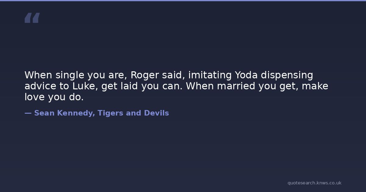 When single you are, Roger said, imitating Yoda dispensing advice to Luke, get laid you can. When married you get, make love you do.