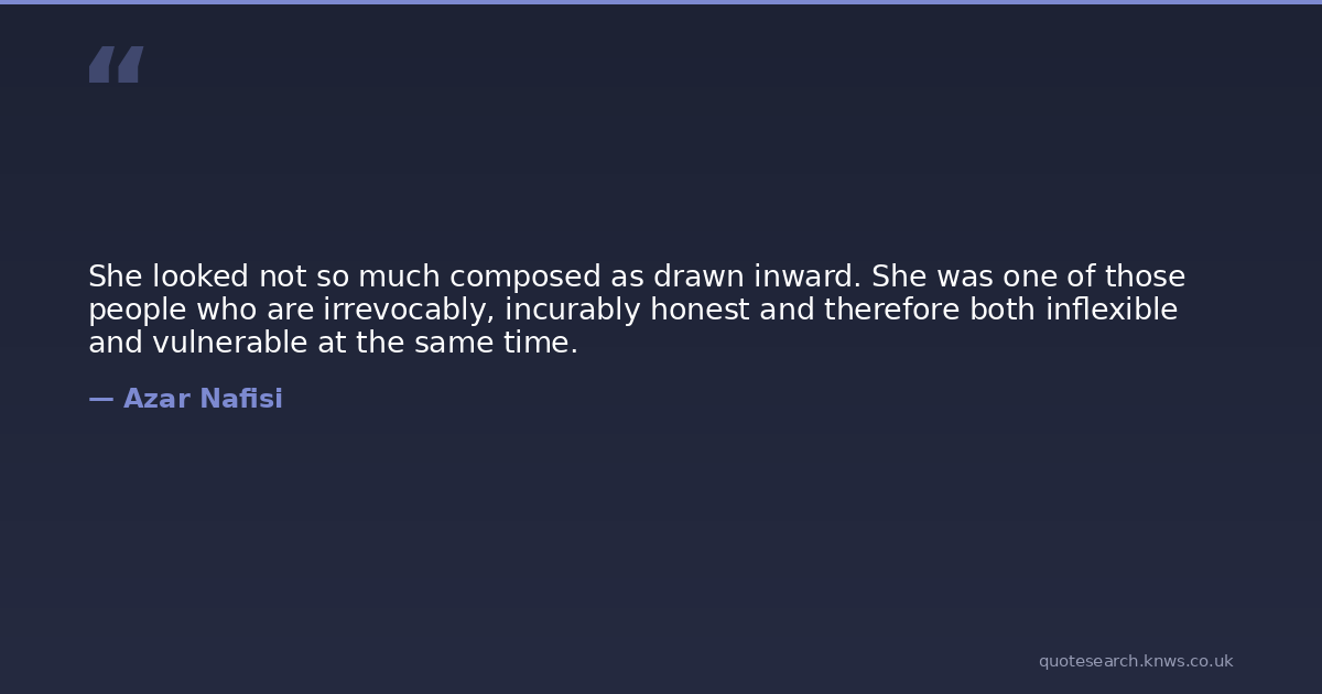 She looked not so much composed as drawn inward. She was one of those people who are irrevocably, incurably honest and therefore both inflexible and vulnerable at the same time.