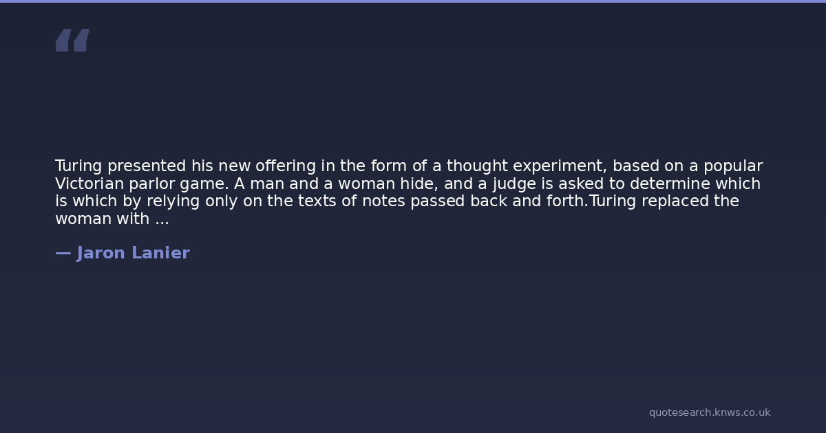 Turing presented his new offering in the form of a thought experiment, based on a popular Victorian parlor game. A man and a woman hide, and a judge is asked to determine which is which by relying only on the texts of notes passed back and forth.Turing replaced the woman with a computer. Can the judge tell which is the man? If not, is the computer conscious? Intelligent? Does it deserve equal rights?It's impossible for us to know what role the torture Turing was enduring at the time played in his formulation of the test. But it is undeniable that one of the key figures in the defeat of fascism was destroyed, by our side, after the war, because he was gay. No wonder his imagination pondered the rights of strange creatures.