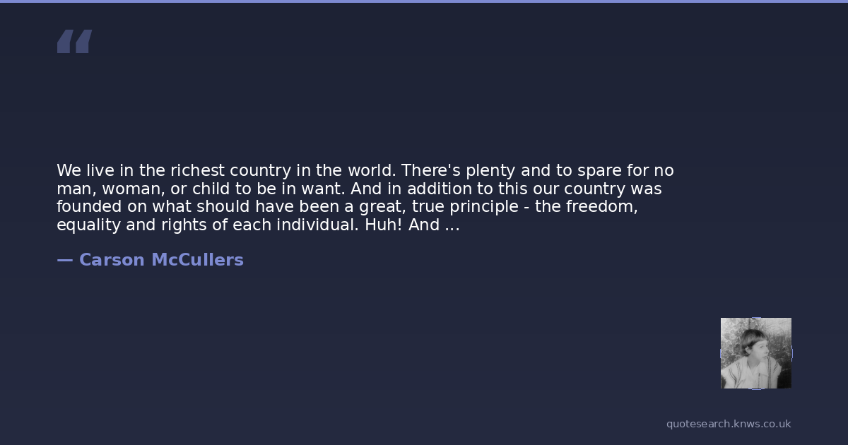 We live in the richest country in the world. There's plenty and to spare for no man, woman, or child to be in want. And in addition to this our country was founded on what should have been a great, true principle - the freedom, equality and rights of each individual. Huh! And what has come of that start? There are corporations worth billions of dollars- and hundreds of thousands of people who don't get to eat.