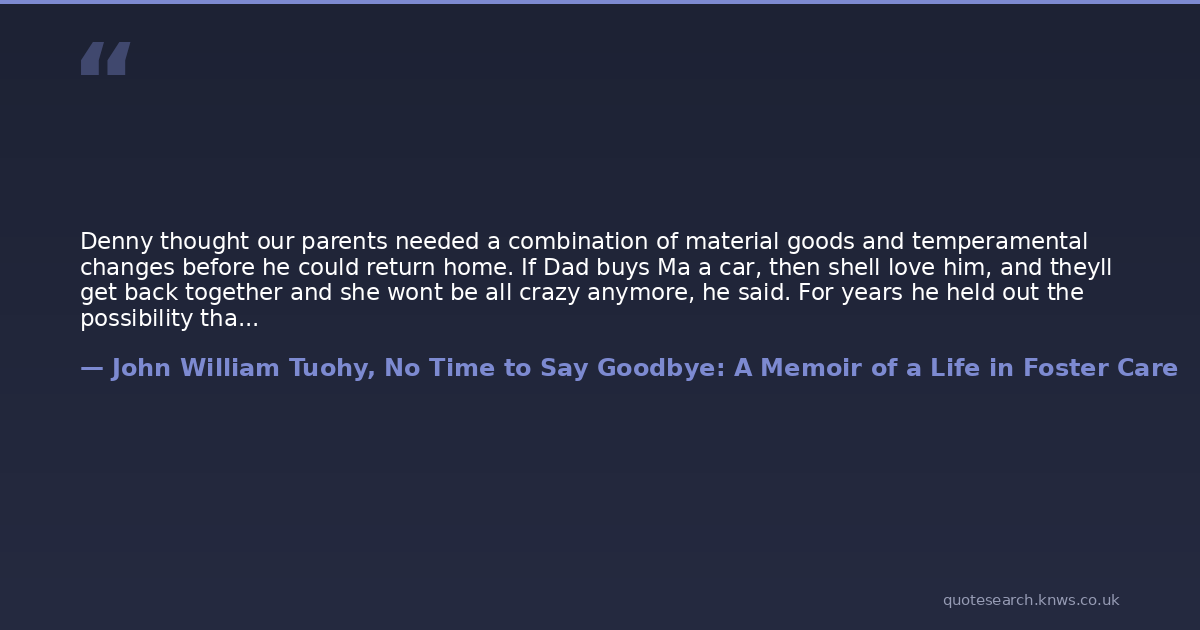 Denny thought our parents needed a combination of material goods and temperamental changes before he could return home. If Dad buys Ma a car, then shell love him, and theyll get back together and she wont be all crazy anymore, he said. For years he held out the possibility that those things would happen and all would change. If we had more things, like stoves and cars, he told me at night in our bedroom, and Ma wasnt like she is, we could go home.