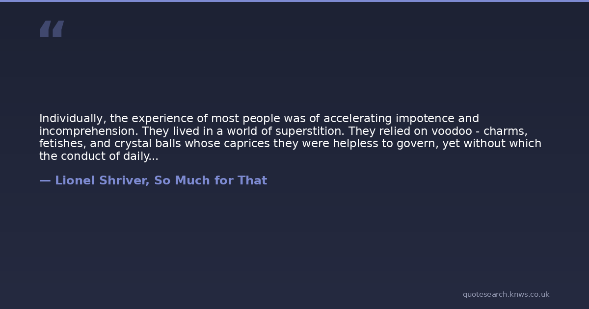 Individually, the experience of most people was of accelerating impotence and incomprehension. They lived in a world of superstition. They relied on voodoo - charms, fetishes, and crystal balls whose caprices they were helpless to govern, yet without which the conduct of daily life came to a standstill. Faith that the computer would switch on one more time and do as it was asked had more a religious than a rational cast. When the screen went black, the gods were angry.