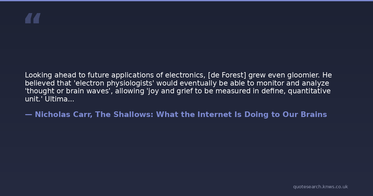 Looking ahead to future applications of electronics, [de Forest] grew even gloomier. He believed that 'electron physiologists' would eventually be able to monitor and analyze 'thought or brain waves', allowing 'joy and grief to be measured in define, quantitative unit.' Ultimately, he concluded, 'a professor may be able to implant knowledge into the reluctant brains of his 22nd century pupils. What terrifying political possibilities may be lurking there! Let us be thankful that such things are only for posterity, not for us.