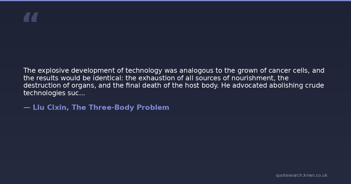 The explosive development of technology was analogous to the grown of cancer cells, and the results would be identical: the exhaustion of all sources of nourishment, the destruction of organs, and the final death of the host body. He advocated abolishing crude technologies such as fossil fuels and nuclear energy and keeping gentler technologies such as solar power and small-scale hydroelectric power.