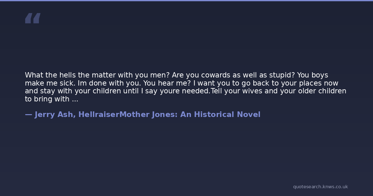 What the hells the matter with you men? Are you cowards as well as stupid? You boys make me sick. Im done with you. You hear me? I want you to go back to your places now and stay with your children until I say youre needed.Tell your wives and your older children to bring with them dish pans and cooking pots. Tell them to bring their stirring spoons and ladles. Tell them to carry a mop over their shoulders. Were goin to march on that mine and were going to stand guard to see that no scabs are allowed in. Do you hear me? Mother Jones