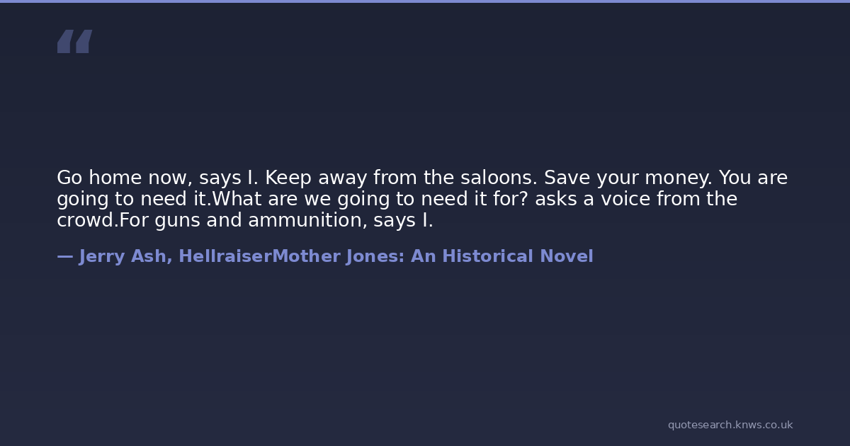 Go home now, says I. Keep away from the saloons. Save your money. You are going to need it.What are we going to need it for? asks a voice from the crowd.For guns and ammunition, says I.