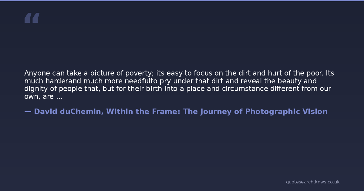 Anyone can take a picture of poverty; its easy to focus on the dirt and hurt of the poor. Its much harderand much more needfulto pry under that dirt and reveal the beauty and dignity of people that, but for their birth into a place and circumstance different from our own, are just like ourselves. I want my images to tell the story of those people and to move us beyond pity to justice and mercy.