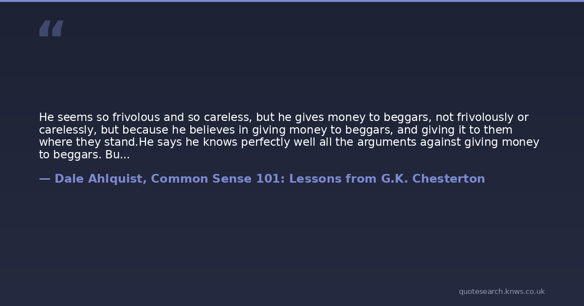 He seems so frivolous and so careless, but he gives money to beggars, not frivolously or carelessly, but because he believes in giving money to beggars, and giving it to them where they stand.He says he knows perfectly well all the arguments against giving money to beggars. But he finds those to be precisely the arguments for giving money to them. If beggars are lazy or deceptive or wanting a drink, he knows only too well his own lack of motivation, his own dishonesty, his own thirst.He doesnt believe in scientific charity because that is too easy, as easy as writing a check. He believes in promiscuous charity because that is really difficult. It means the most dark and terrible of all human actionstalking to a man. In fact, I know of nothing more difficult than really talking to the poor men we meet. (pp. 13-14)