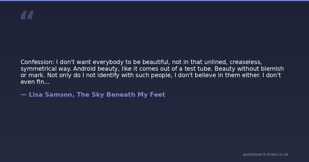 Confession: I don't want everybody to be beautiful, not in that unlined, creaseless, symmetrical way. Android beauty, like it comes out of a test tube. Beauty without blemish or mark. Not only do I not identify with such people, I don't believe in them either. I don't even find them attractive. This is what makes watching television so hard: they don't cast actors anymore, only models. When they make a movie of my life, they'd better cast a character actor in the lead. Don't try to tell me I'm not a character.
