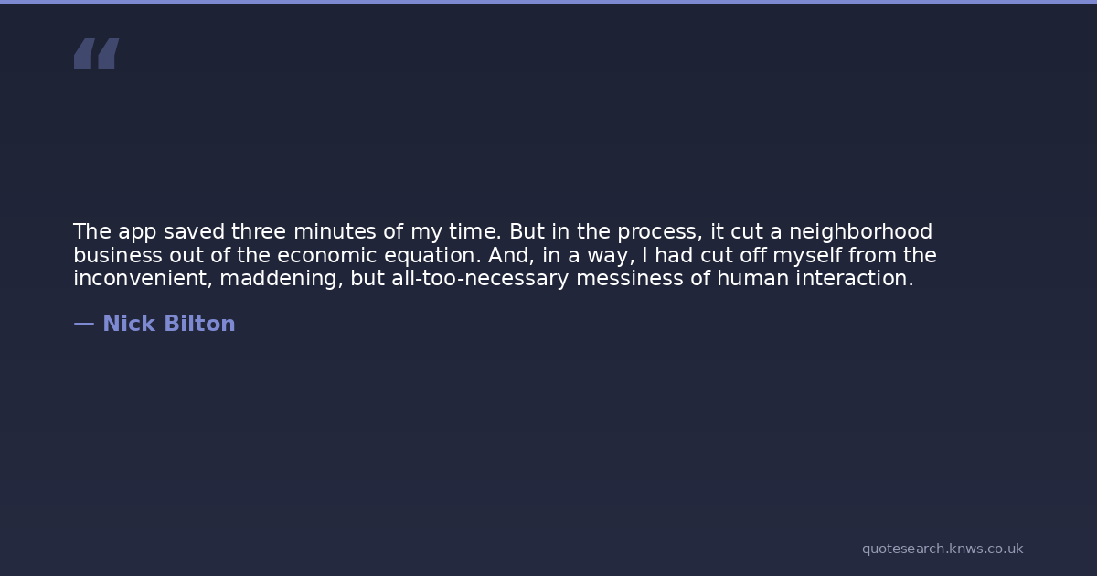 The app saved three minutes of my time. But in the process, it cut a neighborhood business out of the economic equation. And, in a way, I had cut off myself from the inconvenient, maddening, but all-too-necessary messiness of human interaction.