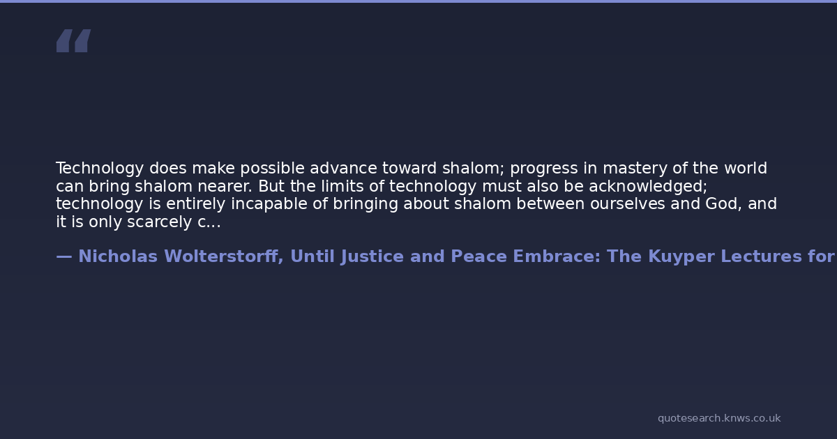 Technology does make possible advance toward shalom; progress in mastery of the world can bring shalom nearer. But the limits of technology must also be acknowledged; technology is entirely incapable of bringing about shalom between ourselves and God, and it is only scarcely capable of bringing about the love of self and neighbour.