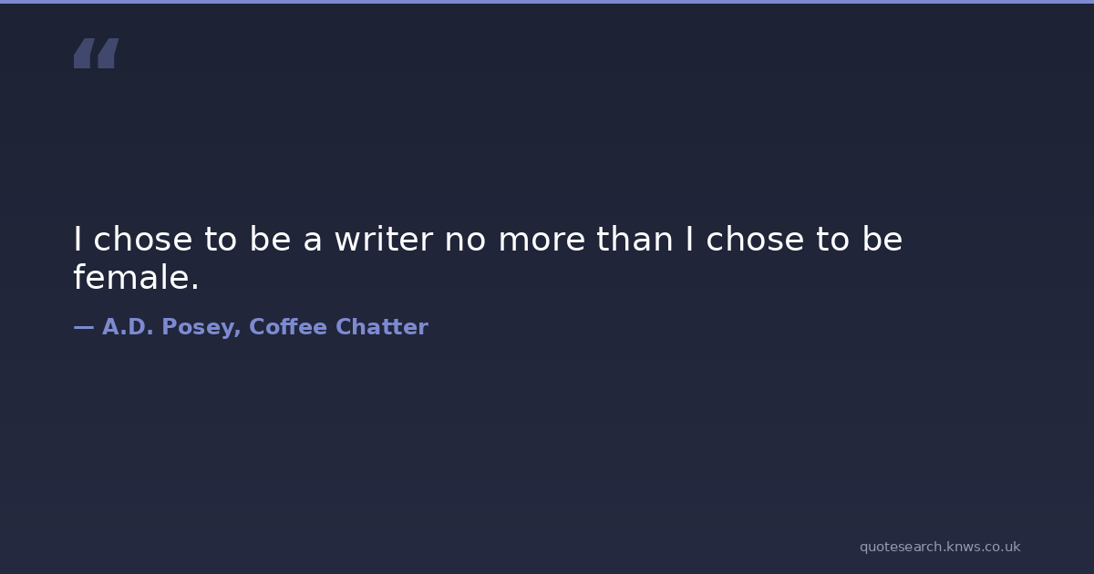 I chose to be a writer no more than I chose to be female. ad-posey chose coffee-chatter female inspirational storytellers storytelling write writer writers writing writing-quotes Download Image Share on X Share on Facebook Copy Link