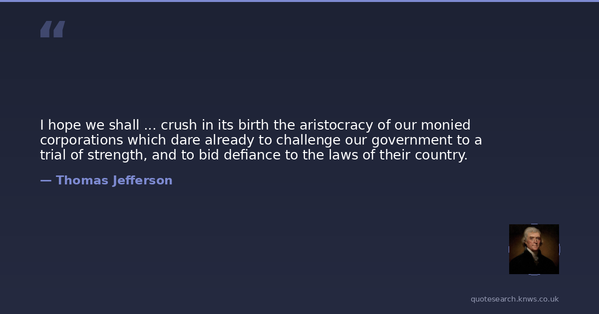 I hope we shall ... crush in its birth the aristocracy of our monied corporations which dare already to challenge our government to a trial of strength, and to bid defiance to the laws of their country.
