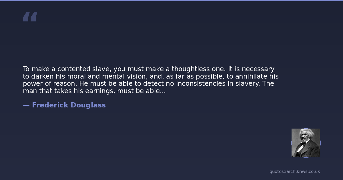 To make a contented slave, you must make a thoughtless one. It is necessary to darken his moral and mental vision, and, as far as possible, to annihilate his power of reason. He must be able to detect no inconsistencies in slavery. The man that takes his earnings, must be able to convince him that he has a perfect right to do so. It must not depend upon mere force; the slave must know no Higher Law than his master's will. The whole relationship must not only demonstrate, to his mind, its necessity, but its absolute rightfulness.