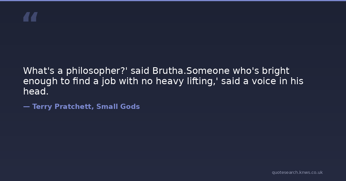 What's a philosopher?' said Brutha.Someone who's bright enough to find a job with no heavy lifting,' said a voice in his head.