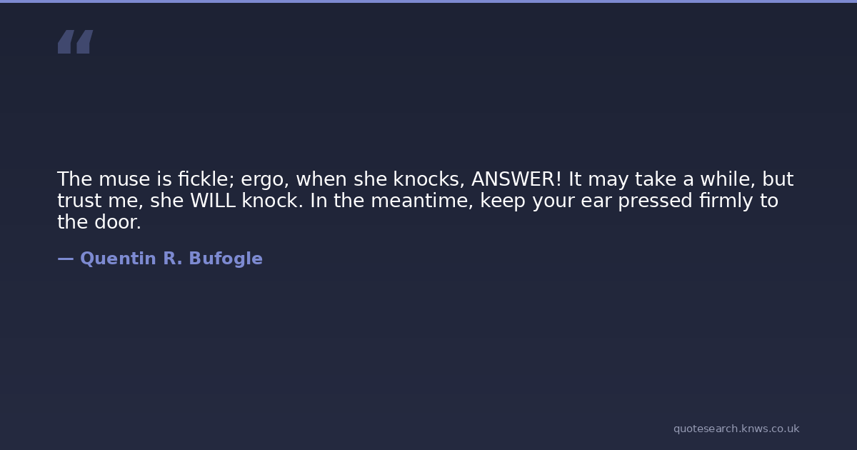 The muse is fickle; ergo, when she knocks, ANSWER! It may take a while, but trust me, she WILL knock. In the meantime, keep your ear pressed firmly to the door.