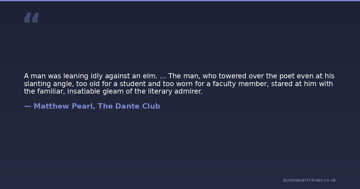 A man was leaning idly against an elm. ... The man, who towered over the poet even at his slanting angle, too old for a student and too worn for a faculty member, stared at him with the familiar, insatiable gleam of the literary admirer.
