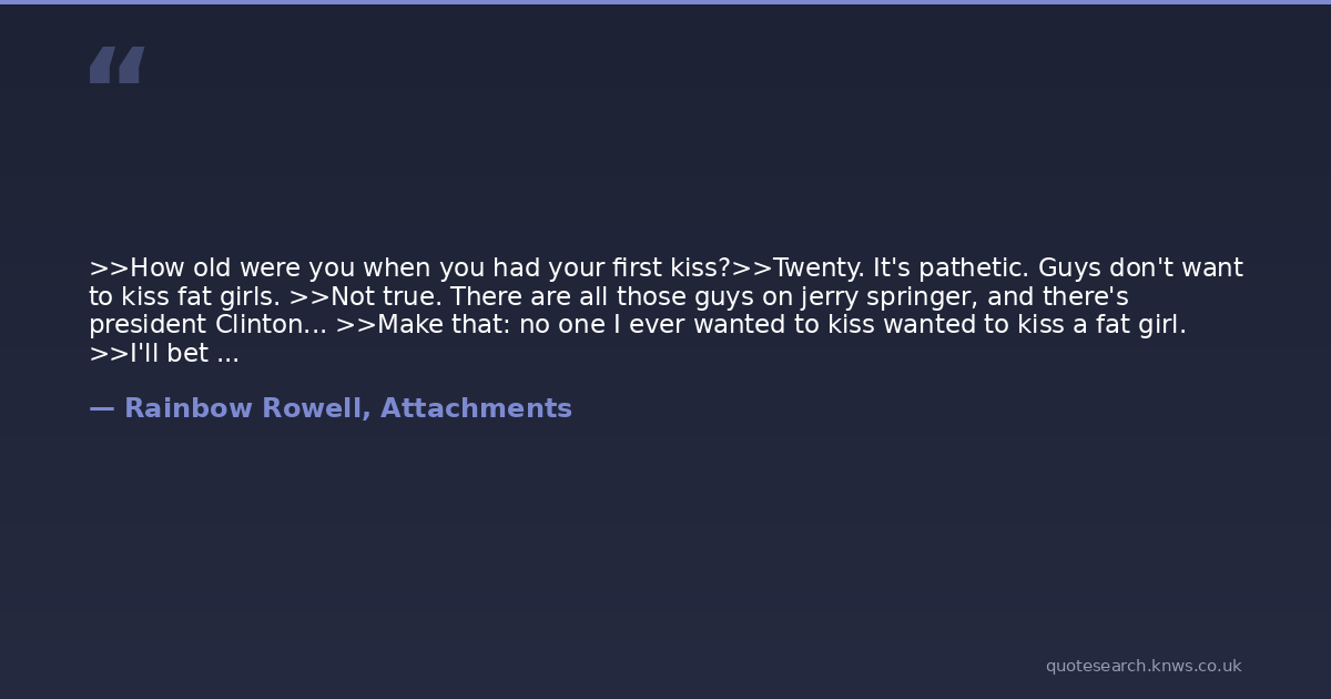 >>How old were you when you had your first kiss?>>Twenty. It's pathetic. Guys don't want to kiss fat girls. >>Not true. There are all those guys on jerry springer, and there's president Clinton... >>Make that: no one I ever wanted to kiss wanted to kiss a fat girl. >>I'll bet you never gave anyone a chance. Mitch says you practically beat him away with a stick.>>I was trying to spare him.
