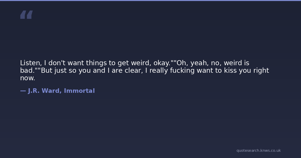 Listen, I don't want things to get weird, okay.""Oh, yeah, no, weird is bad.""But just so you and I are clear, I really fucking want to kiss you right now.