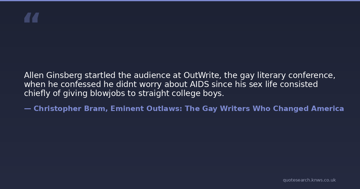 Allen Ginsberg startled the audience at OutWrite, the gay literary conference, when he confessed he didnt worry about AIDS since his sex life consisted chiefly of giving blowjobs to straight college boys.
