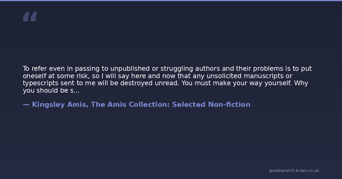 To refer even in passing to unpublished or struggling authors and their problems is to put oneself at some risk, so I will say here and now that any unsolicited manuscripts or typescripts sent to me will be destroyed unread. You must make your way yourself. Why you should be so set on the nearly always disappointing profession is a puzzling question.