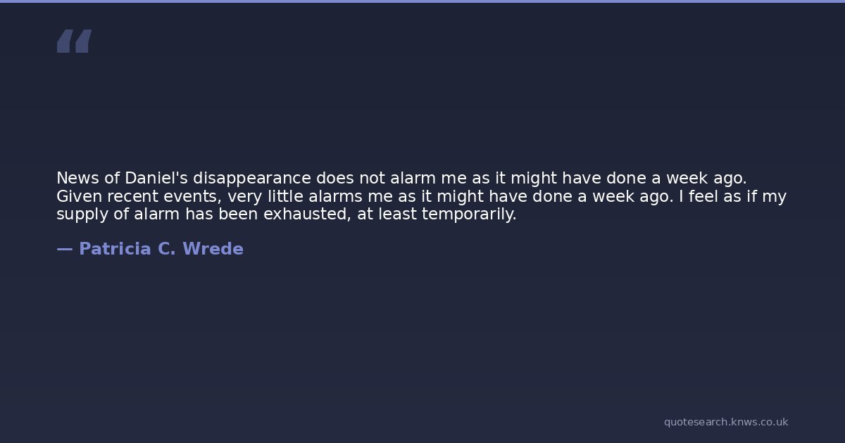 News of Daniel's disappearance does not alarm me as it might have done a week ago. Given recent events, very little alarms me as it might have done a week ago. I feel as if my supply of alarm has been exhausted, at least temporarily.
