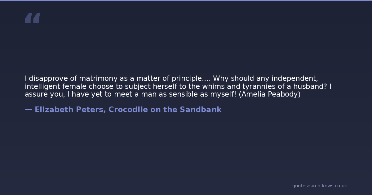 I disapprove of matrimony as a matter of principle.... Why should any independent, intelligent female choose to subject herself to the whims and tyrannies of a husband? I assure you, I have yet to meet a man as sensible as myself! (Amelia Peabody)