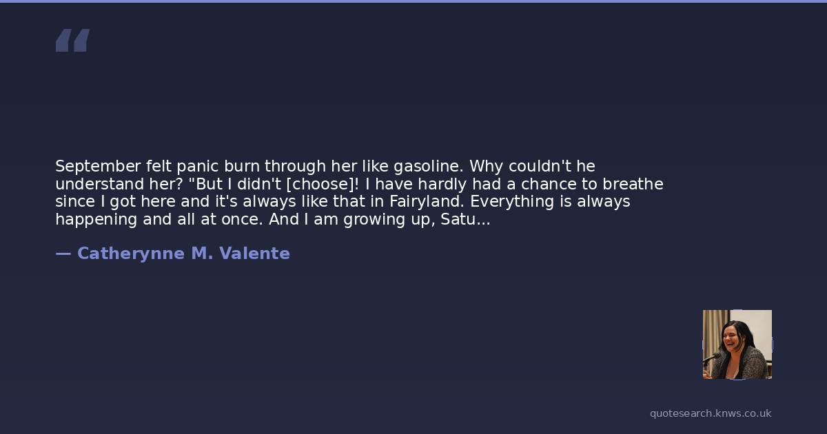 September felt panic burn through her like gasoline. Why couldn't he understand her? "But I didn't [choose]! I have hardly had a chance to breathe since I got here and it's always like that in Fairyland. Everything is always happening and all at once. And I am growing up, Saturday! I am growing up and I have read books, so many books, and I know that growing up means you can't keep going to Fairyland the way you did when you were a child! Something happens to you and suddenly you have to keep a straight face and a straight line and I am afraid! I want something grand and I don't want to know what it is before it happens!
