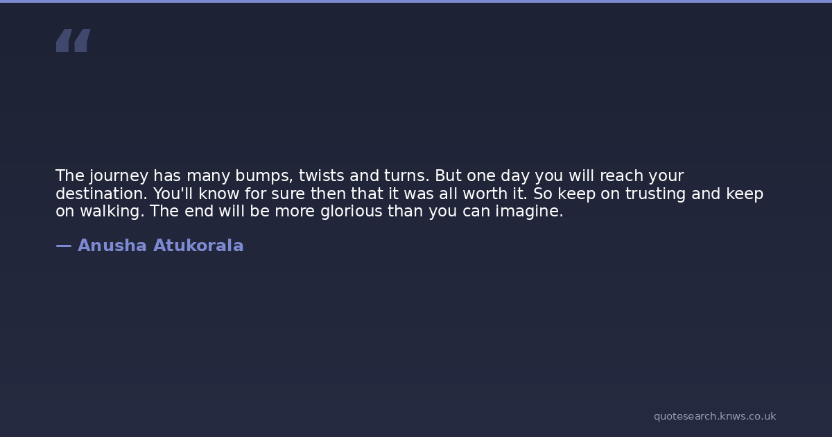 The journey has many bumps, twists and turns. But one day you will reach your destination. You'll know for sure then that it was all worth it. So keep on trusting and keep on walking. The end will be more glorious than you can imagine.